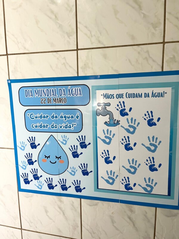 Nosso Painel Interativo “Mãos que Cuidam da Água” é perfeito para envolver as crianças de forma lúdica e educativa. Elas poderão pintar as mãozinhas de azul e carimbar no painel, simbolizando o compromisso com a preservação da água.