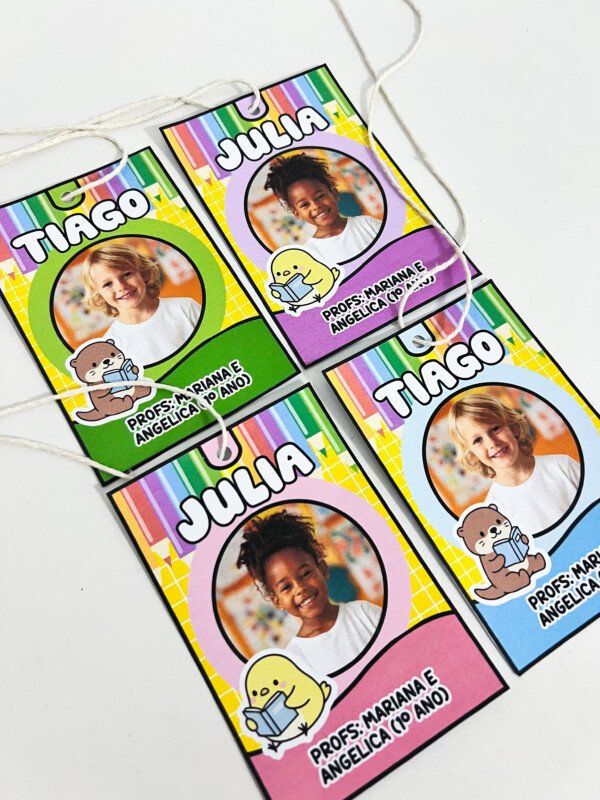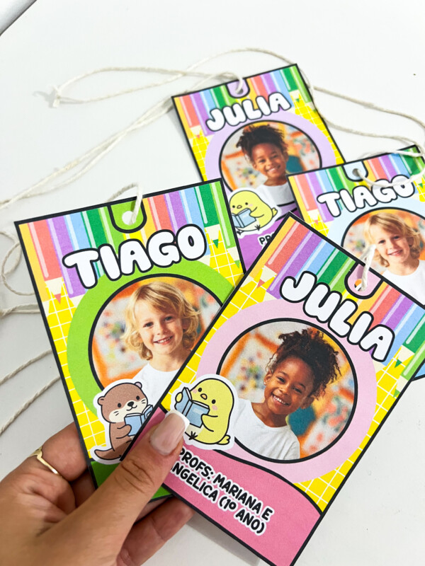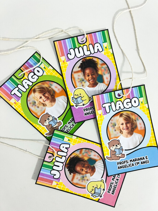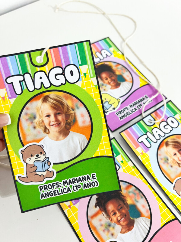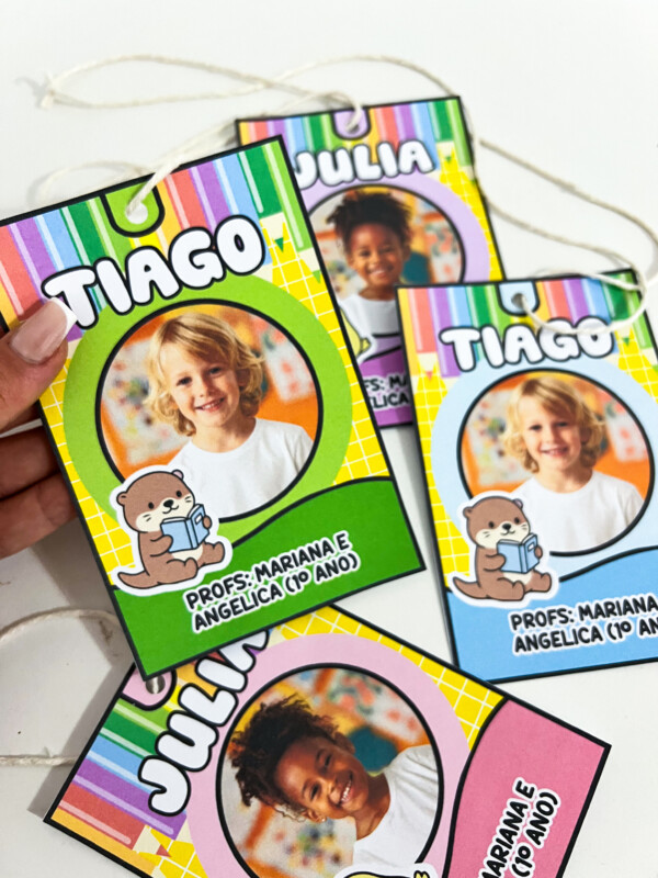 Crachás de pescoço personalizados, ideais para identificação dos alunos no dia a dia escolar. O material possui design alegre e colorido, perfeito para educação infantil e anos iniciais, ajudando a criar um ambiente acolhedor e organizado.