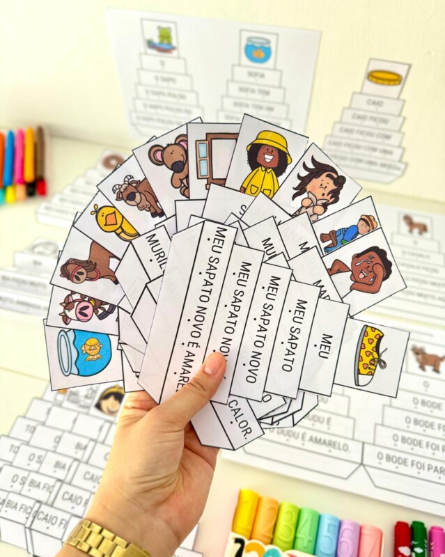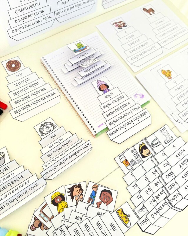 🔠 As frases evoluem gradualmente, com aumento de palavras para promover fluência e automatização
