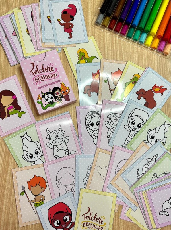 O arquivo Jogo da Memória Folclore acompanha 32 fichas diferentes, e uma caixinha para guardar o material.